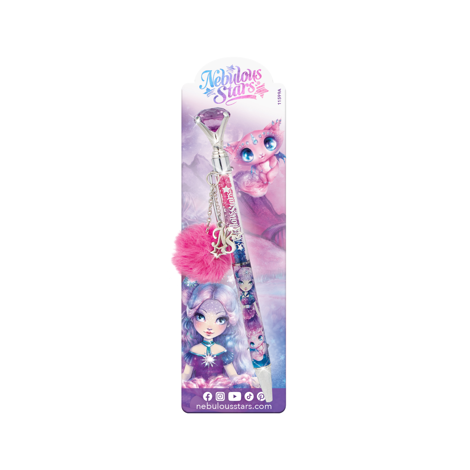 Długopis wykończony kryształem z charmsami – pomponem i błyszczącymi literami. Wypróbuj elegancki gadżet ze świata Nebulous.