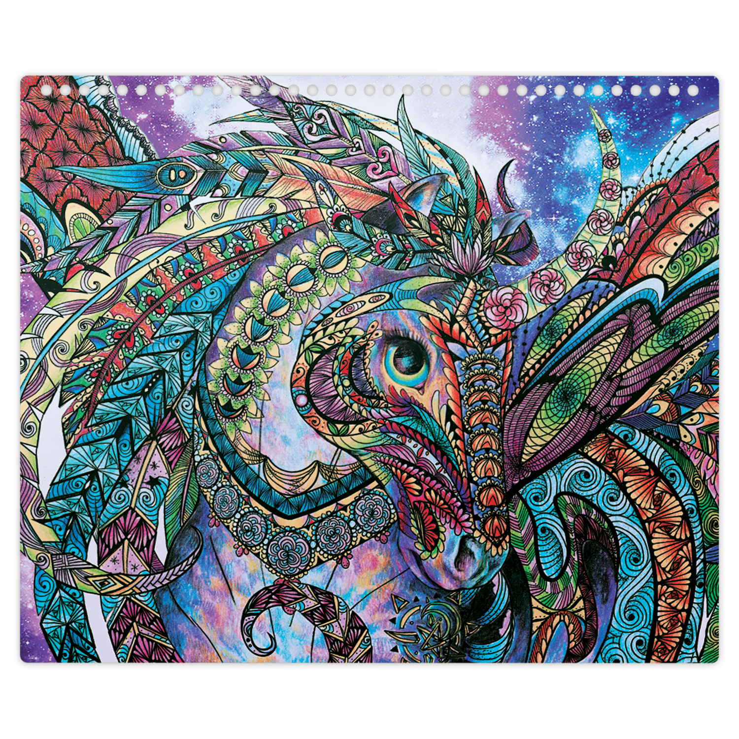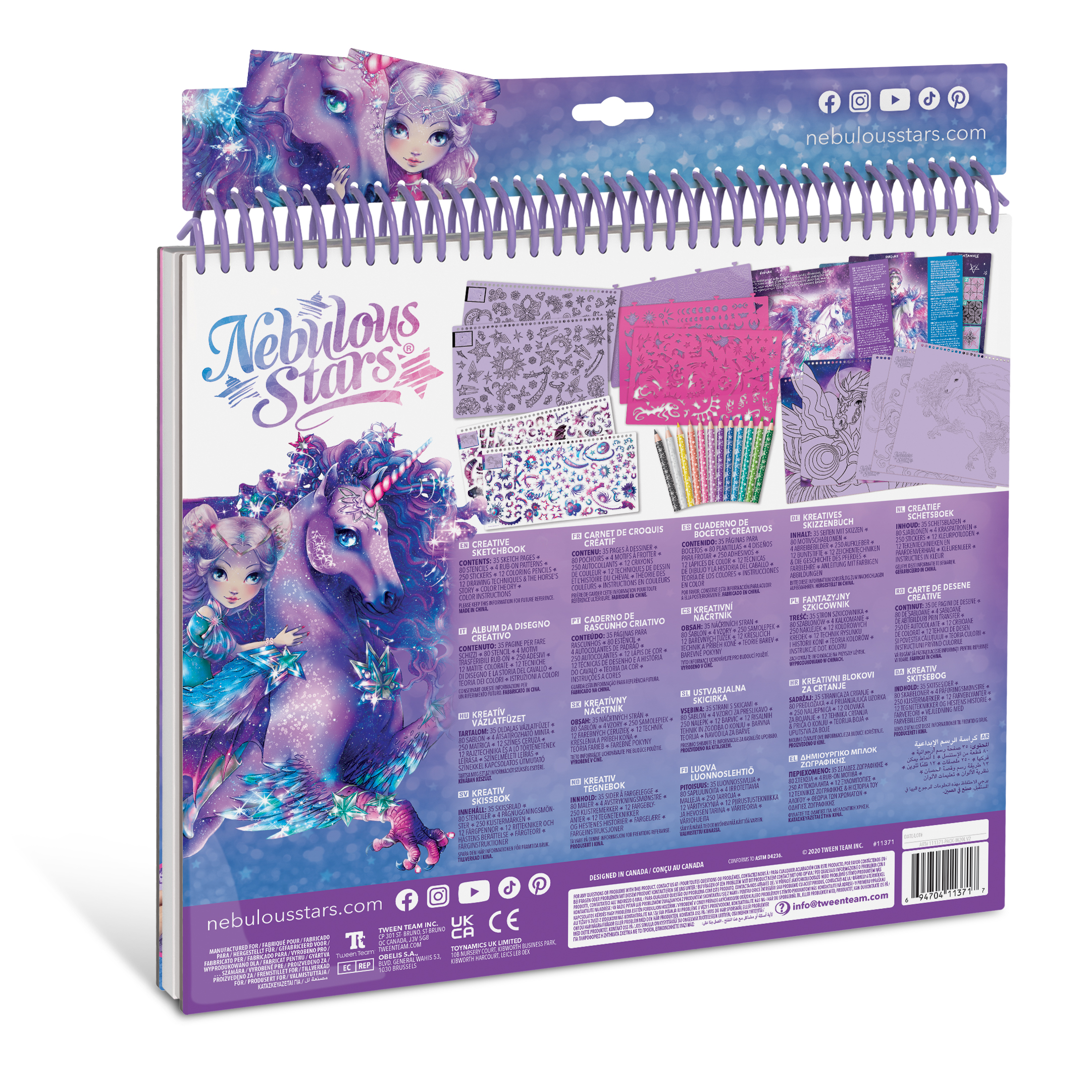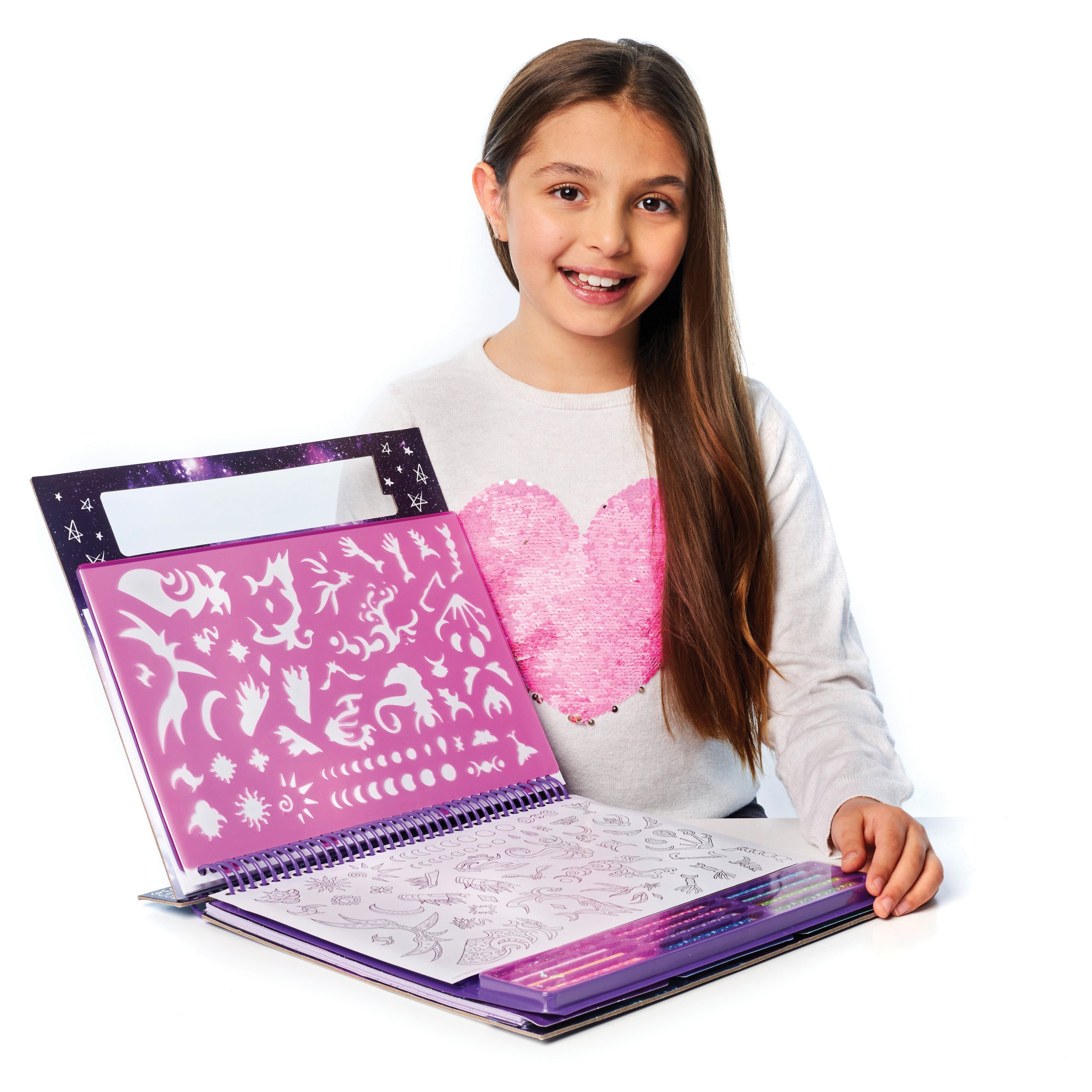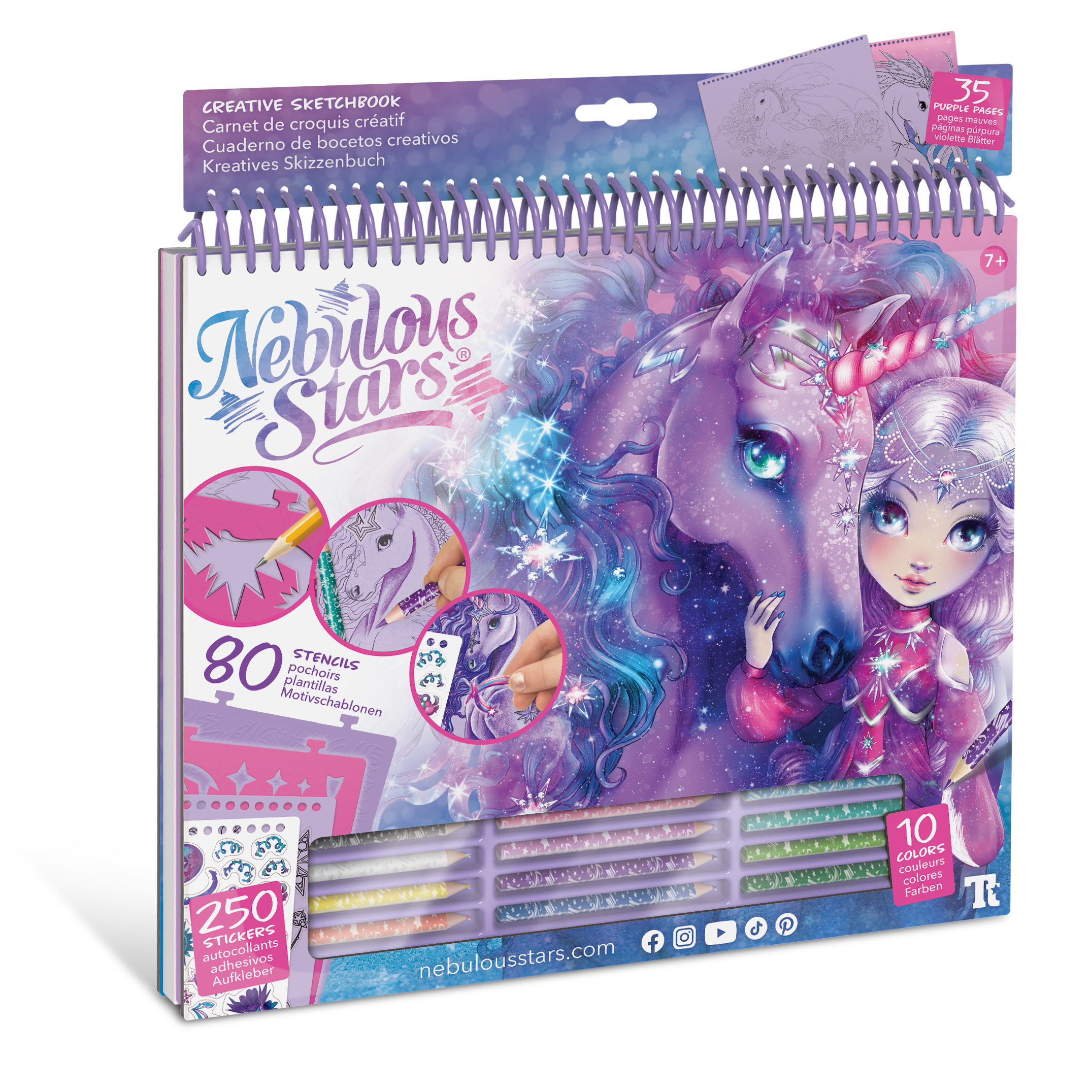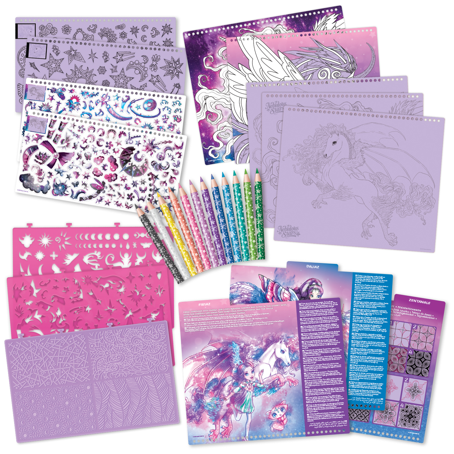 Szkicownik z kolorowymi kartkami w zestawie z kredkami oraz naklejkami i szablonami. Poznaj magiczne konie Firiaz i Daliaz ze świata Nebulous Stars.