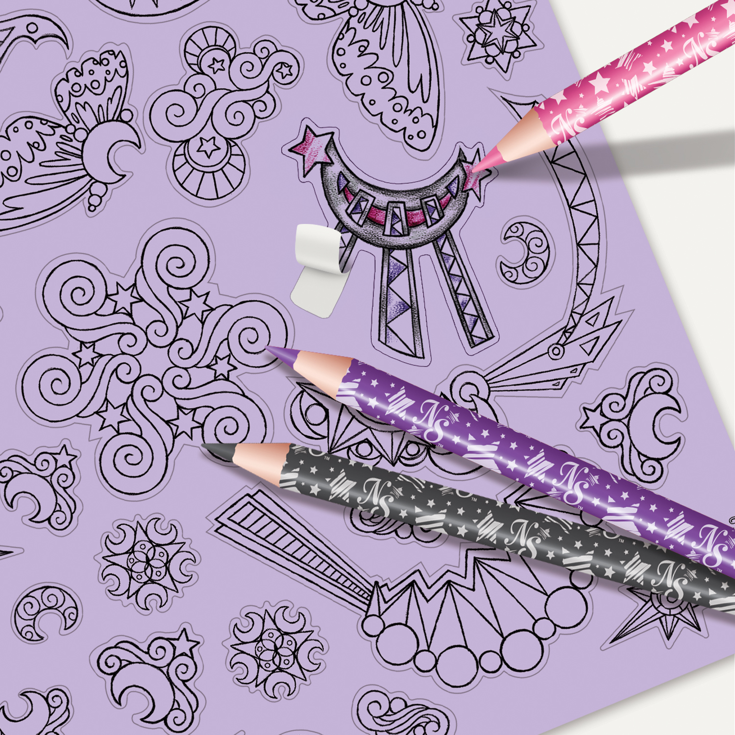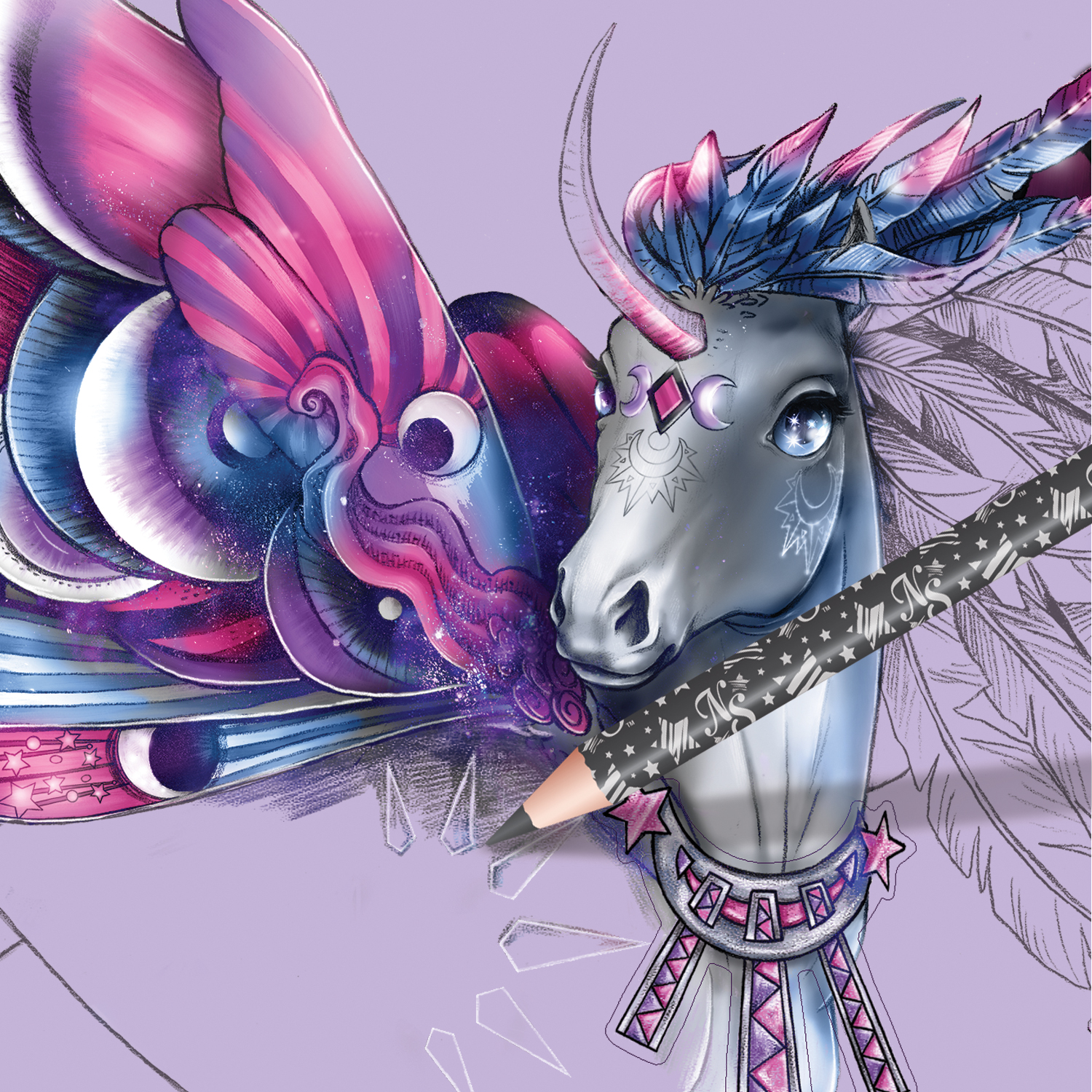 Narysuj oszałamiająco piękne magiczne konie Firiaz i Dialiaz z magicznej krainy Nebulous. Towarzyszy Nebulii i Eclipsii możesz ozdobić załączonymi do zestawu 250 naklejkami, 80 szablonami, jak również kredkami w 12 kolorach. To aż 35 kolorowych stron do zapełnienia!
